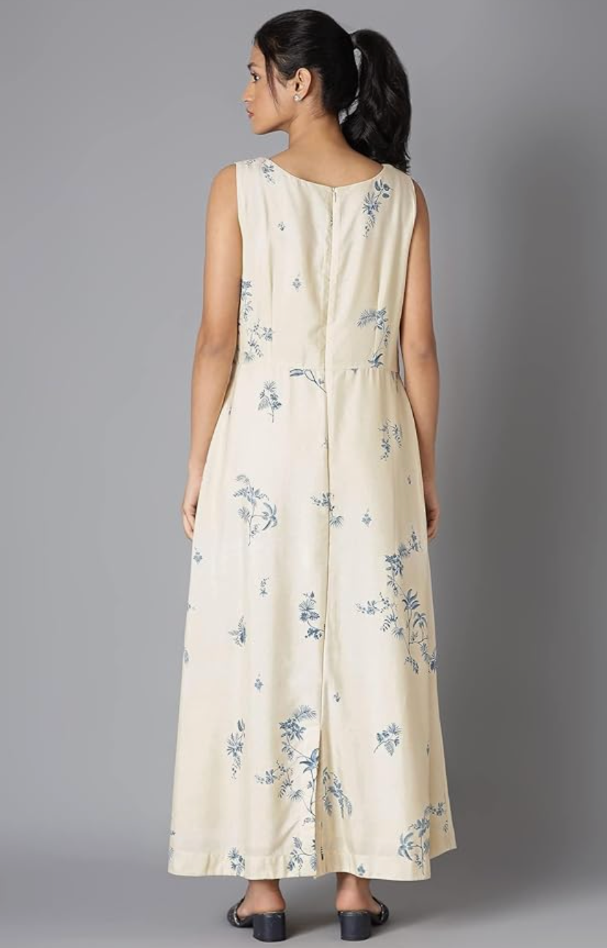W for Woman Women Ecru Floral Sleeveless Ankle Length Dress in Round Neck
